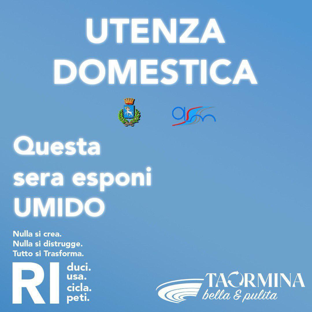 Per le Utenze domestiche e non domestiche, ricadenti nell’ASSE COMMERCIALE TRA PORTA CATANIA E PORTA MESSINA (PIAZZA DUOMO, PIAZZA CARMINE, CORSO UMBERTO I, PIAZZA VITTORIO EMANUELE, VIA TIMEO, VIA TEATRO GRECO, VIA PIRANDELLO FINO ALL'INGRESSO DELL'IMPIANTO FUNIVIARIO, VIA APOLLO ARCAGETA, VIA DI GIOVANNI, VIA CALAPITRULLI, VIA GIARDINAZZO, VIA CAPPUCCINI E VIA DIETRO CAPPUCCINI SINO AL NUMERO CIVICO 10), dovranno esporre i rifiuti dalle ore 01,30 alle ore 05,00 del giorno previsto per la raccolta