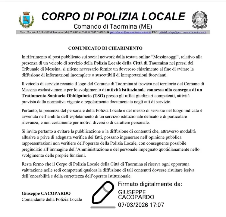 In riferimento a quanto circolato sui social sulla presenza di un veicolo della Polizia Locale di Taormina nei pressi del Tribunale di Messina, si precisa che il mezzo era impegnato esclusivamente nello svolgimento di un’attività istituzionale connessa alla consegna di un TSO, come previsto dalla no