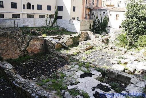 Sul lato nord della Piazza Vittorio Emanuele, nel cortile alle spalle della Caserma dei Carabinieri di Taormina, è stato parzialmente riportato alla luce il settore di un complesso termale che in origine si estendeva ancora verso Nord, sotto il moderno quartiere della “Zecca”, come suggerito dai resti di muri e di arcate in laterizio, inglobate nelle case settecentesche. La costruzione dell’edificio sul lato settentrionale del Foro, avvenuta sigillando un più antico edificio a peristilio, di tipo pubblico, come indicato dai rinvenimenti effettuati (basi di statue con dediche e iscrizioni), risale ai primi secoli dell’età imperiale romana (fine I-II sec.d.C.). Delle Terme sono stati riportati alla luce tre grandi ambienti con funzione di caldaria o tepidaria, con pavimenti a lastre marmoree (crustae), riscaldati da ambienti destinati alla combustione (praefurnia). Come di consueto, pilastrini di mattoni rotondi o squadrati, oggi conservati, consentivano la circolazione dell’aria calda sotto i pavimenti (suspensurae), alimentata anche da tubuli di terracotta posti a ridosso delle pareti intonacate degli ambienti. Tra i materiali restituiti dal sito, si segnalano, in quanto reperti eccezionali, alcuni frammenti di Calendario Romano, databili ad età tardo-augustea o tiberiana (intorno alla prima metà del I sec. d.C.) e un frammento dei Fasti Consulares con l’elenco dei consoli dal 39 al 34 a.C., epigrafi verosimilmente in origine affisse nel foro romano, oggi conservate nell’Antiquarium del Teatro Antico di Taormina.